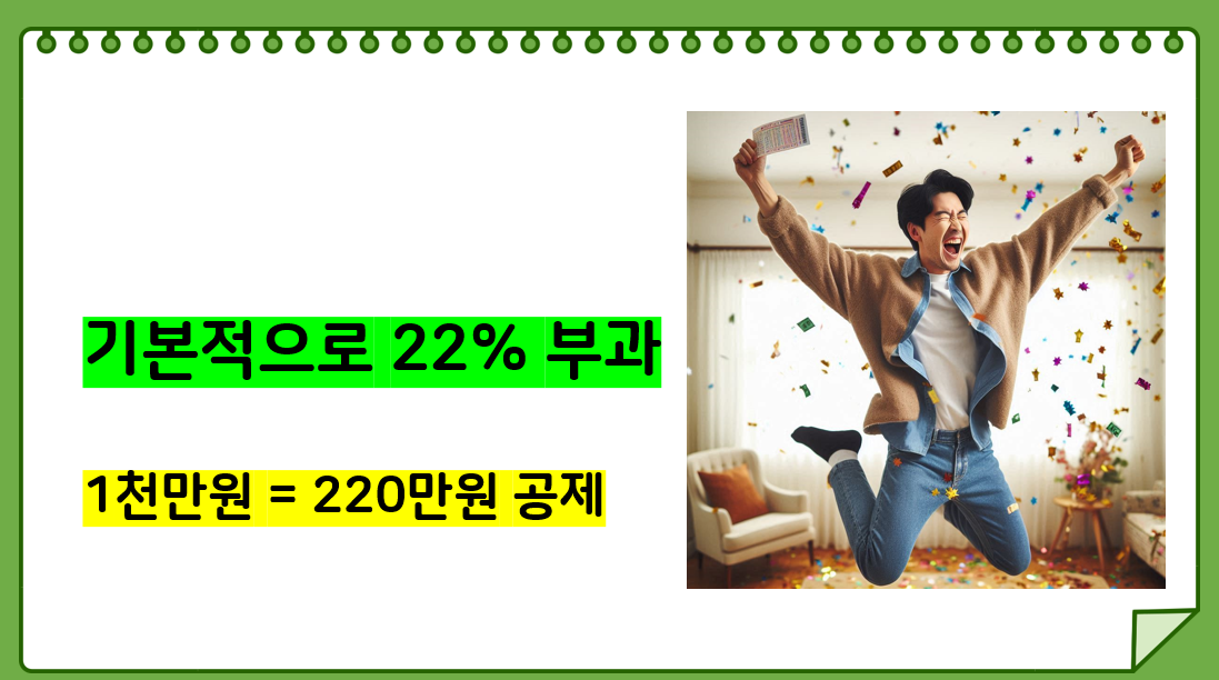 홍길동 씨의 당첨액은 1,000만 원이기 때문에 22%, 즉 220만 원을 제외한 뒤 잔액인 70만 원을 수령하게 될 텐데요.