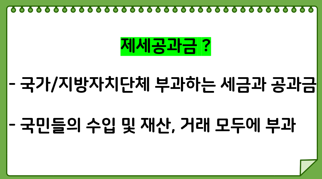 쉽게 말해 국가 및 지방자치단체가 국민의 수입 및 재산, 각종 거래 등에 부과하는 세금 그리고 공과금을 이야기합니다.