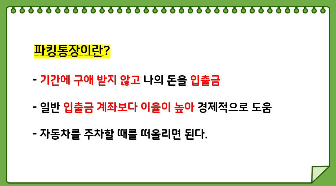 많은 분들이 파킹통장이 무엇에 대해 아실 것 같지만 혹시나 모르는 분들도 있을 수 있어 짧게 요약했는데요.
