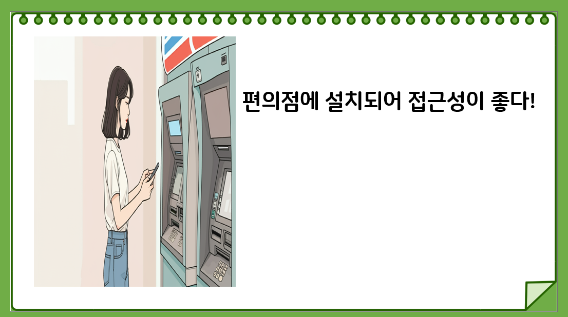 제 기준 가장 큰 장점은 은행 영업시간과 달리 시간/장소에 구애받지 않고 사용할 수 있다는 것이고, 특히 요즘처럼 편의점이 많은 시기에는 더 손쉽게 접할 수 있기에 접근성이 극대화되지 않았나 싶습니다.