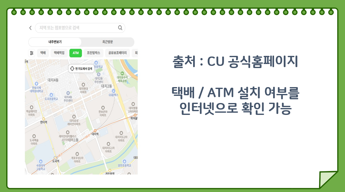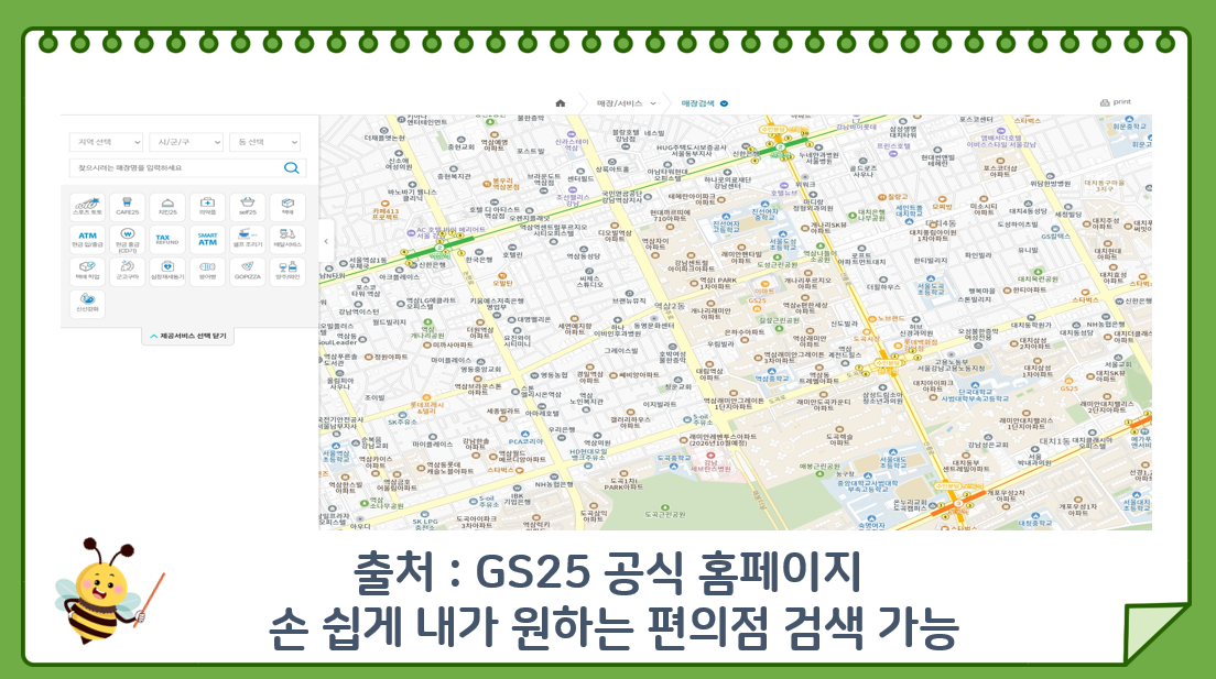 그래서 가시기 전에 체크를 해보는 게 좋은데요. 여기서 꿀팁 GS나 CU 공식 홈페이지에 들어가면 매장별 위치와 어떤 서비스 등을 지원하는지 깔끔하게 정리되어 있으니 활용하셨으면 좋겠다 싶습니다.(심지어 택배나 군고구마 등도 가능한지 적혀있어요. 대박이죠?)