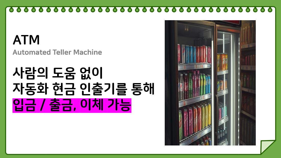 평소 약자로 불리는 경우가 많은데요. 우리나라 말로는 자동화 현금 인출기(Automated_Teller_Machine)라 부른답니다.